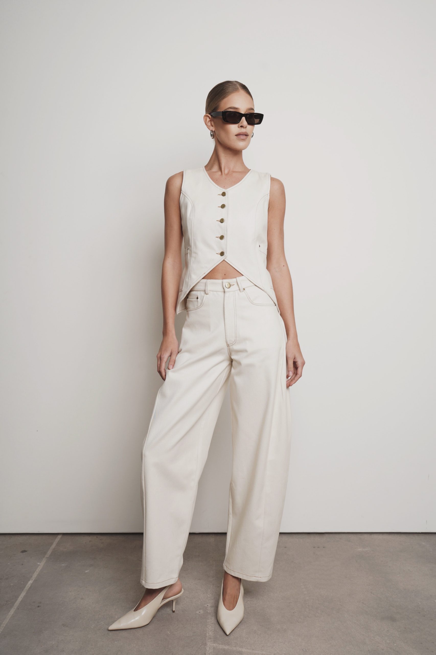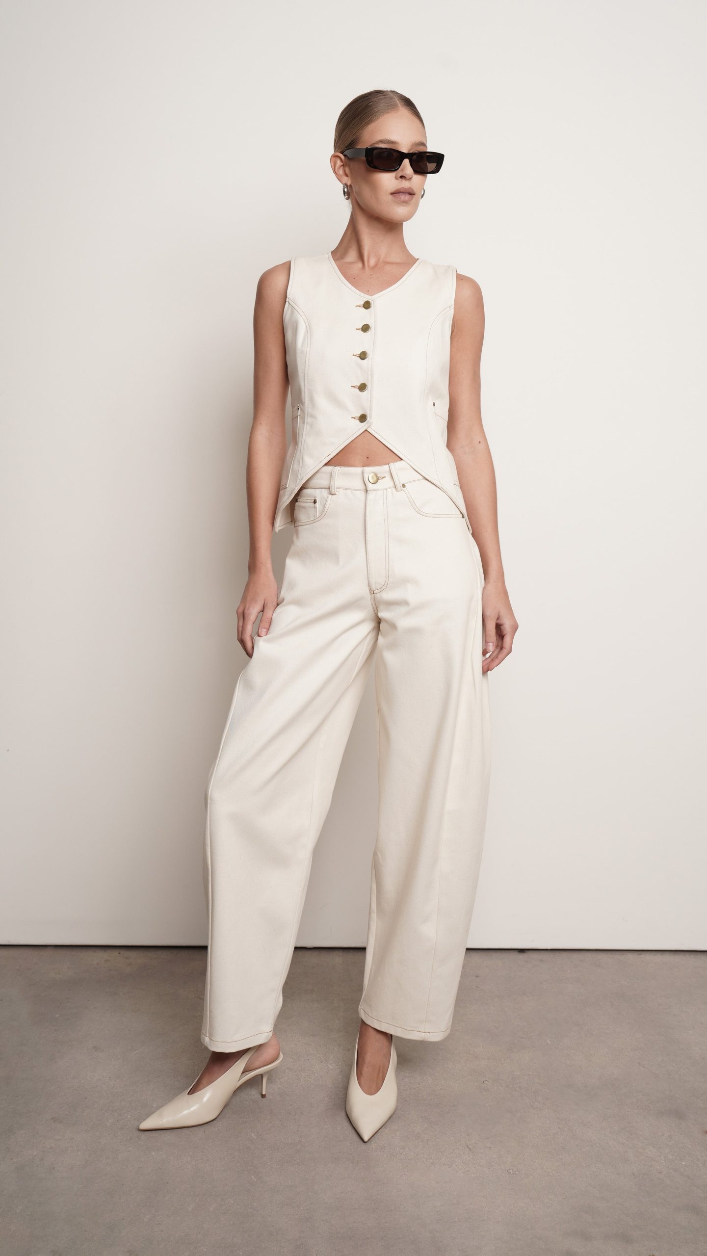 Experience the ultimate in elegance and style with our Jules Vest. Crafted from ivory denim with intricate tan stitching, this vest exudes sophistication. The gold buttons add a touch of luxury, making it a must-have for any fashion-forward individual. Elevate your wardrobe with this exclusive piece.