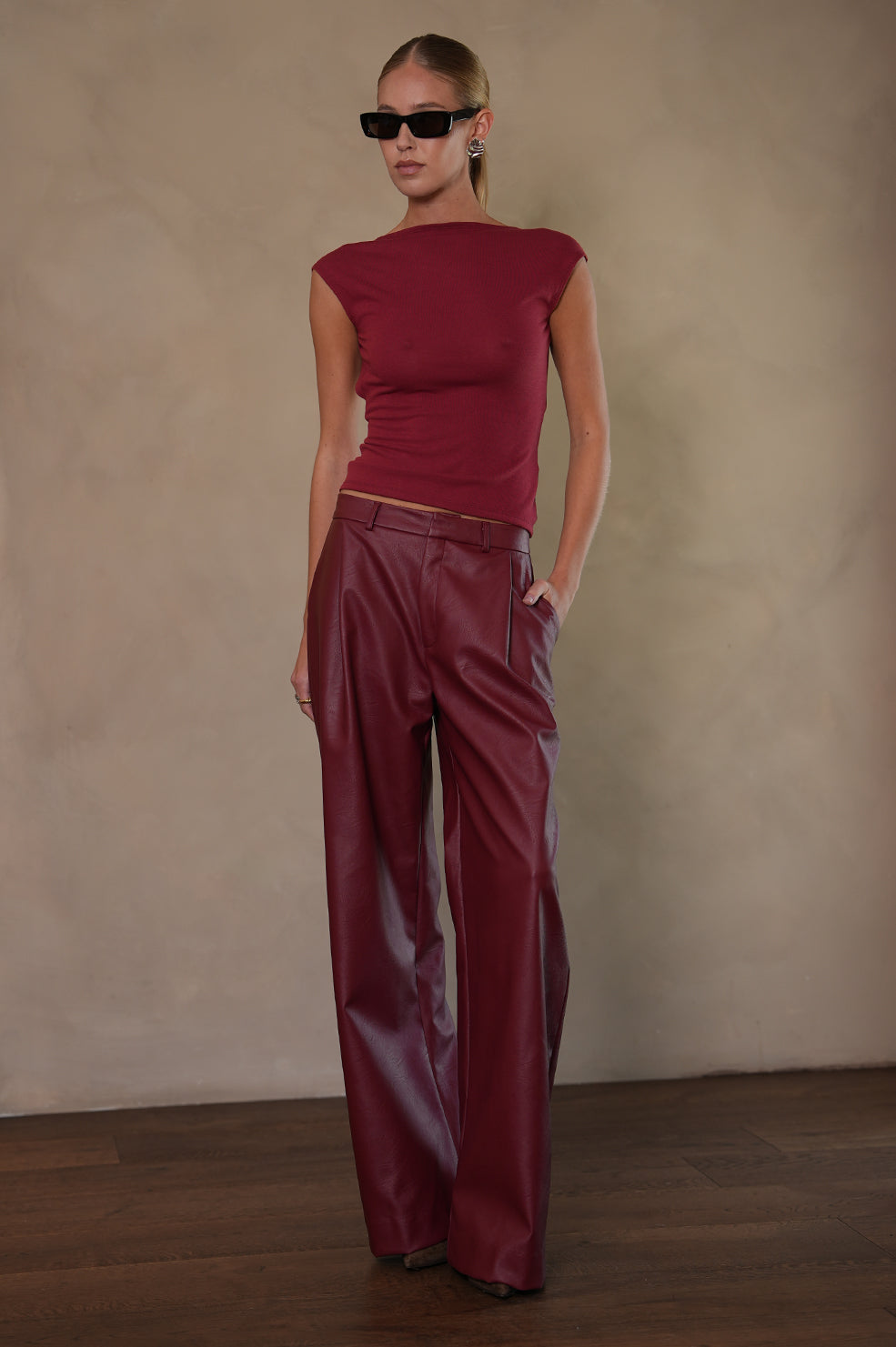 The Milo Pants are crafted in cherry red faux leather, lined for a flawless drape. A wide-leg cut, clasp closure, and belt loops balance modern tailoring with striking color. Effortless to style, they transform everyday dressing into a statement.