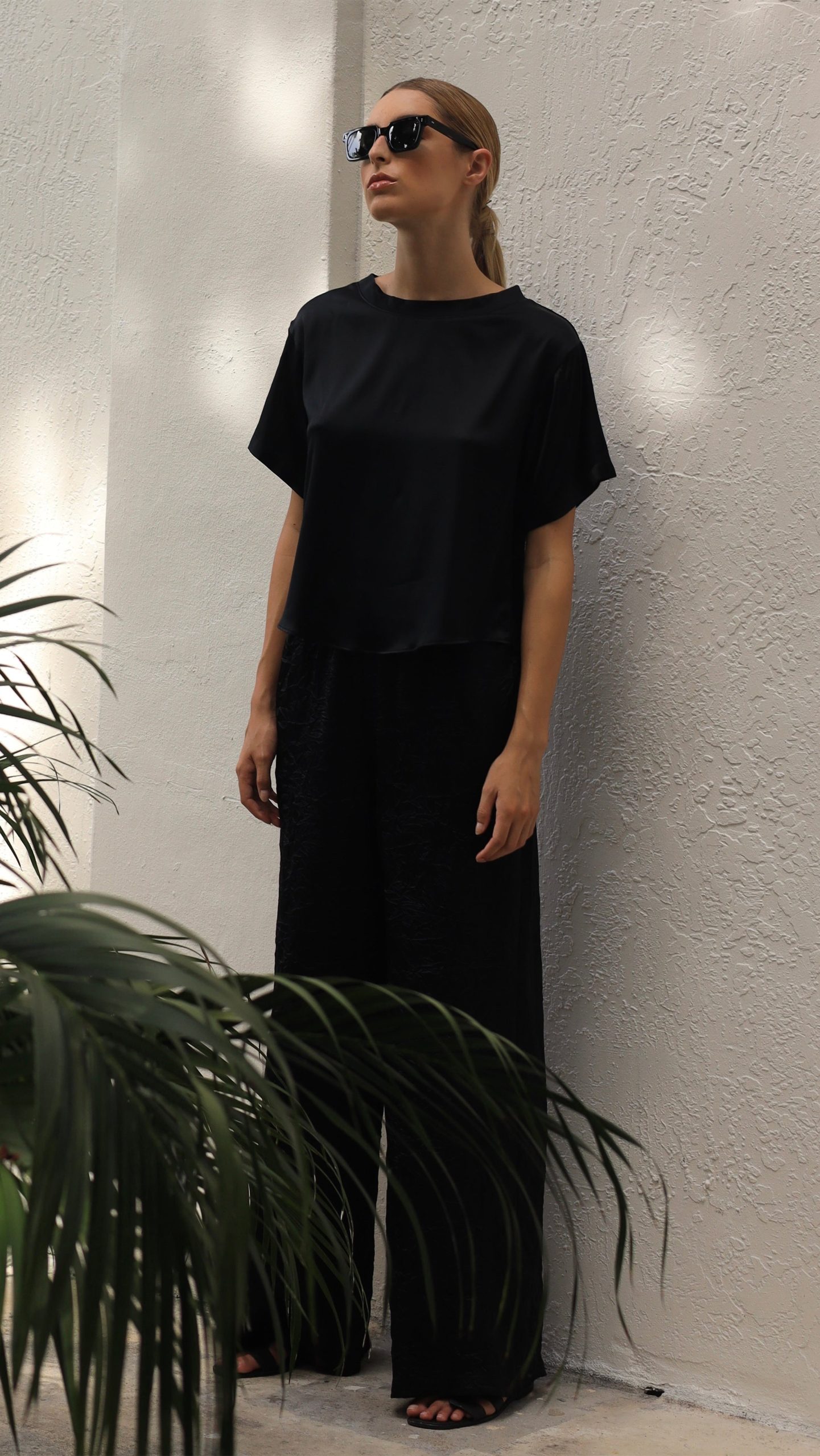 Indulge in luxury with our SILK PANTS in the timeless color of black. Made with a soft and silky fabric, these pants feature an elastic waist for maximum comfort and style. Elevate your wardrobe and embrace the refined sophistication of our silk pants.