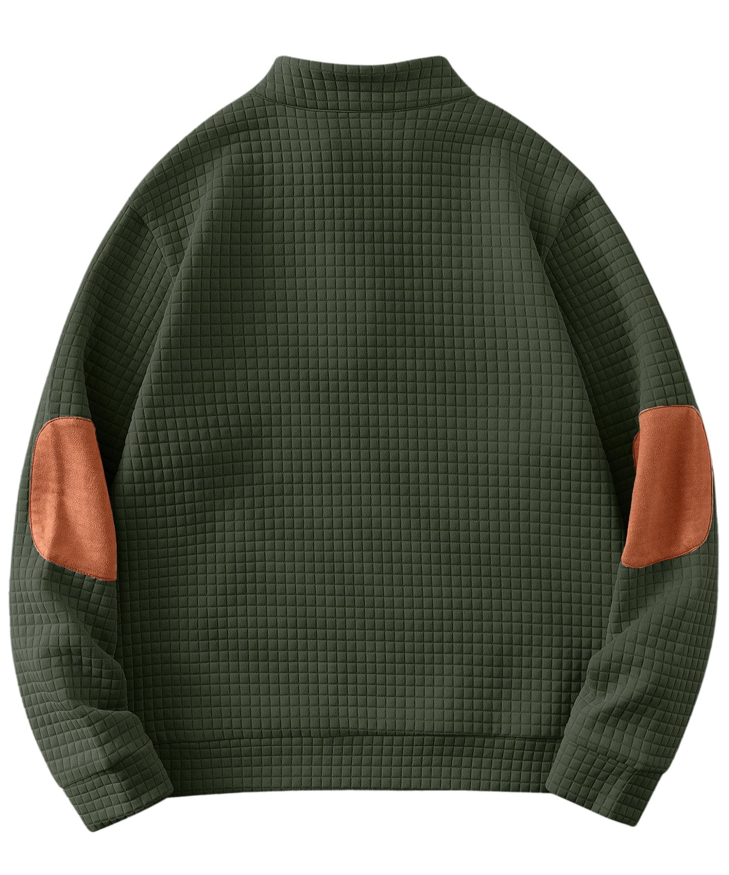Rugged meets refined—this textured pullover features a quilted grid pattern, contrast suede elbow patches, and button-up collar for a bold, outdoorsy look. The perfect blend of function and flair. Comes in 5 different colors.