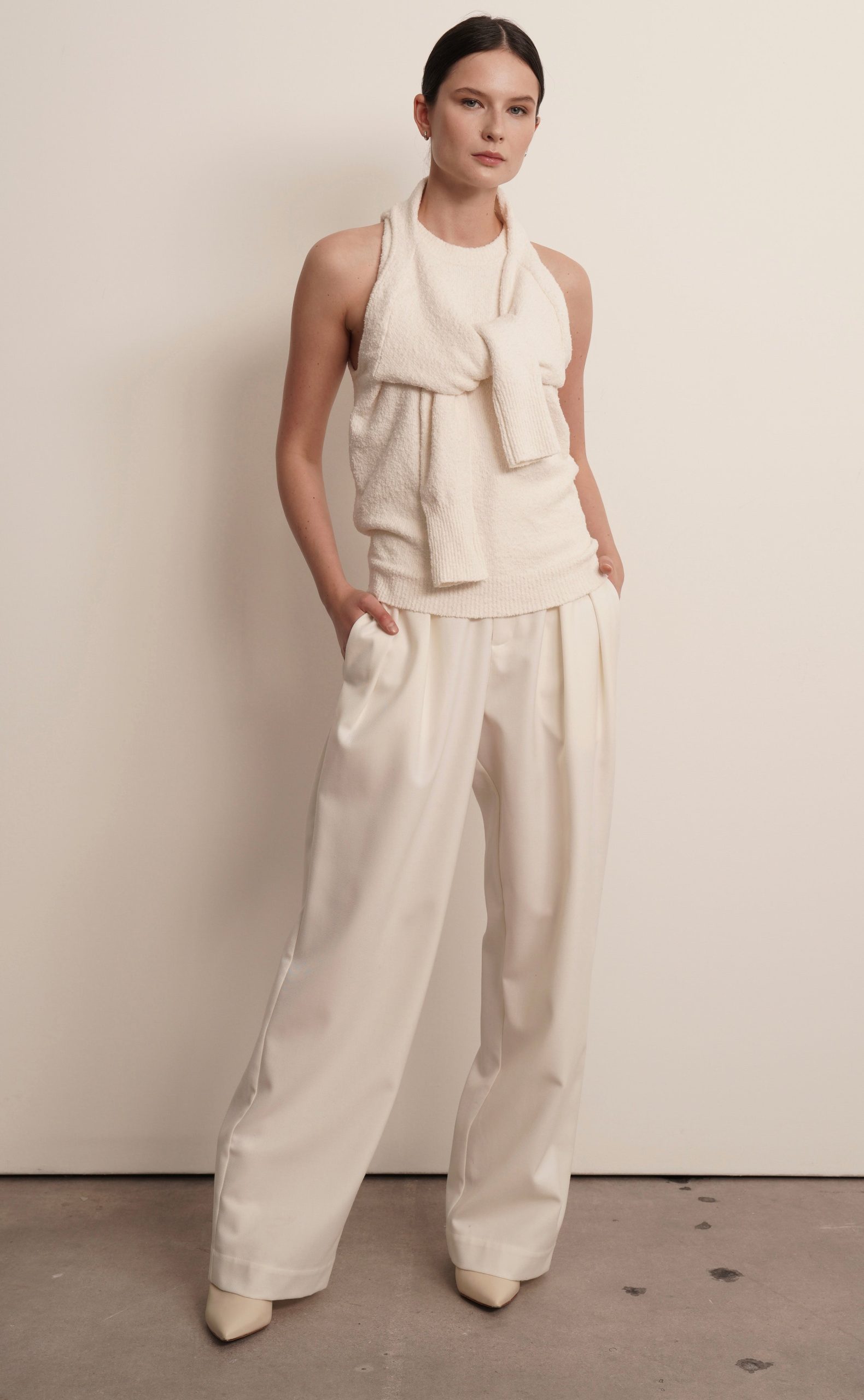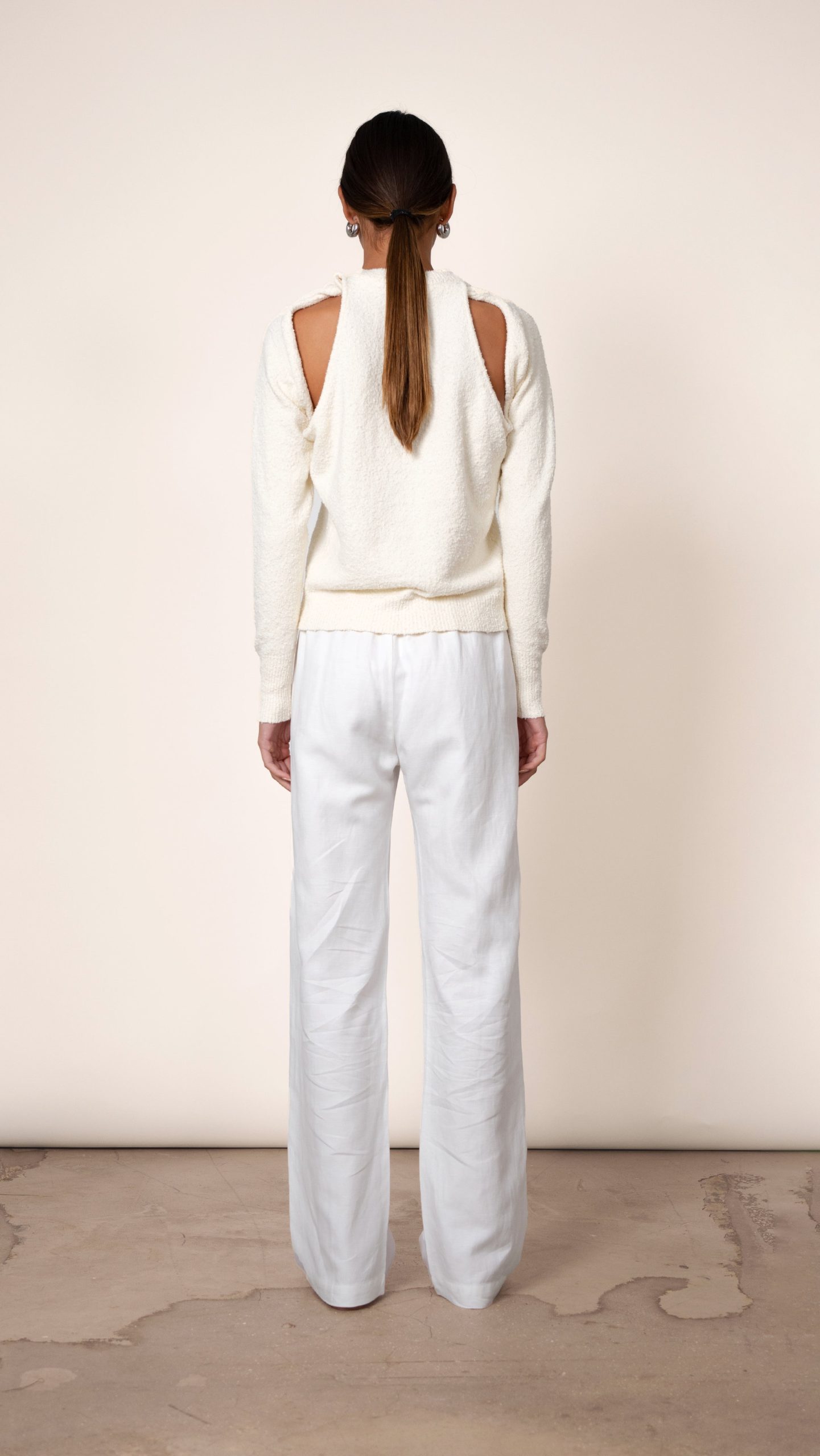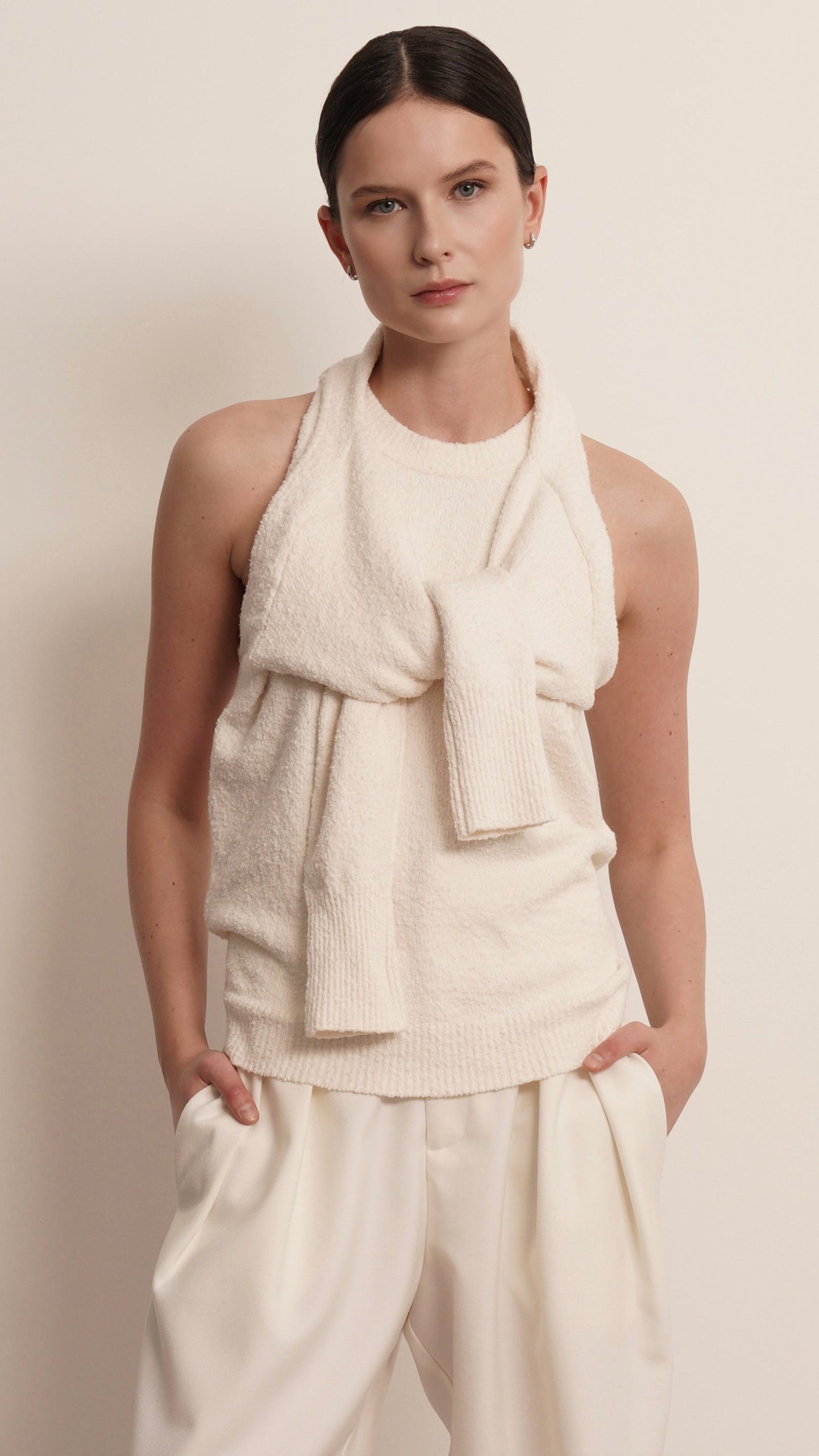 Add versatility and style to your wardrobe with our Wrapped Sweater. Wear it in two fashionable ways – as a halter neck with a unique cutout back, or tie the long sleeves in front for a chic look. Made from soft bouclé, this cozy sweater is the perfect transition piece for any closet.